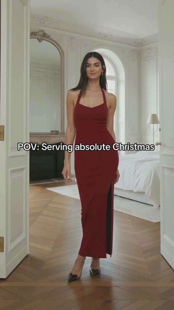 The Cindy - A ruby red, slim fitting, halterneck dress with split. Inspired by Cindy Crawford.