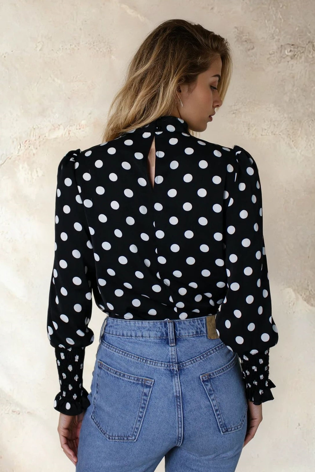 Polka Dot High Neck Blouse with Shirred Sleeves